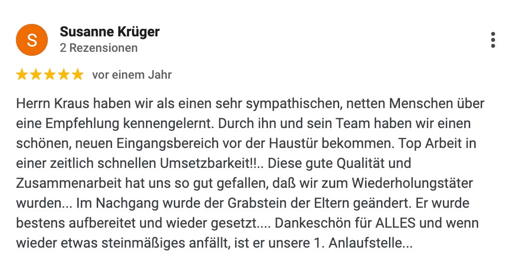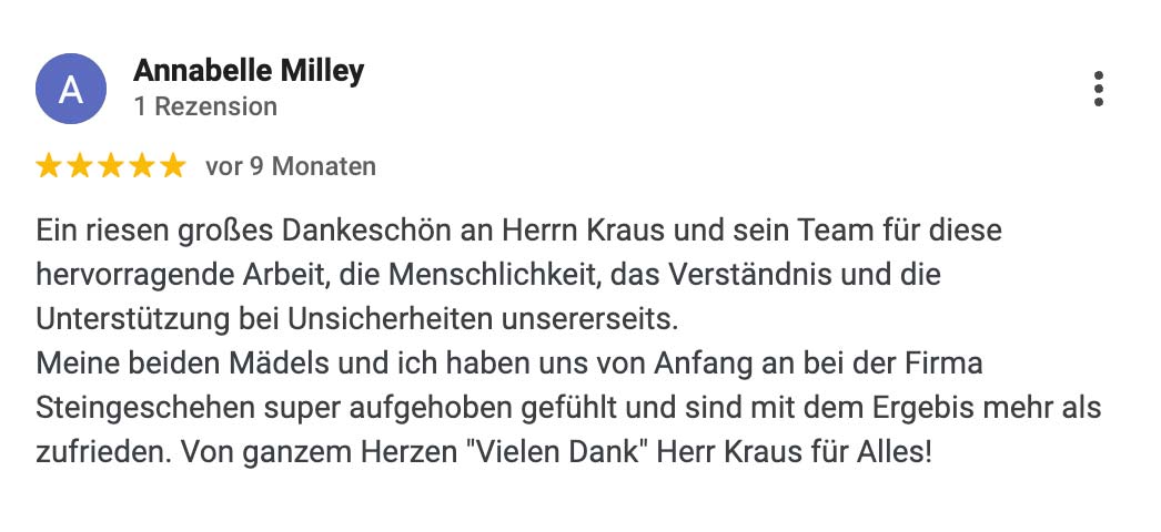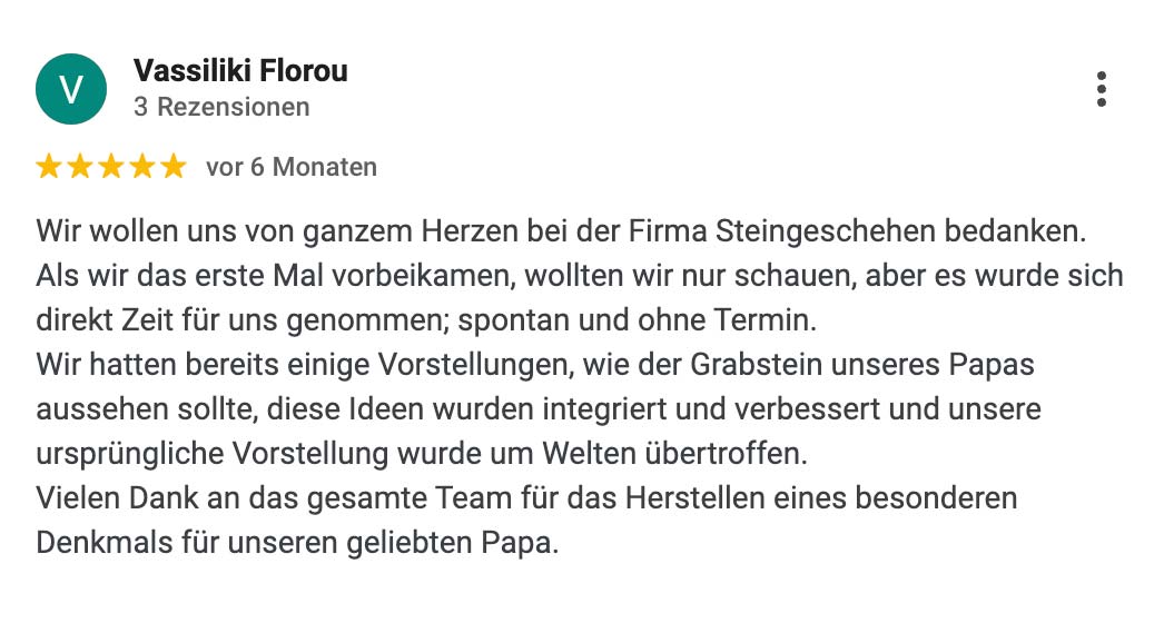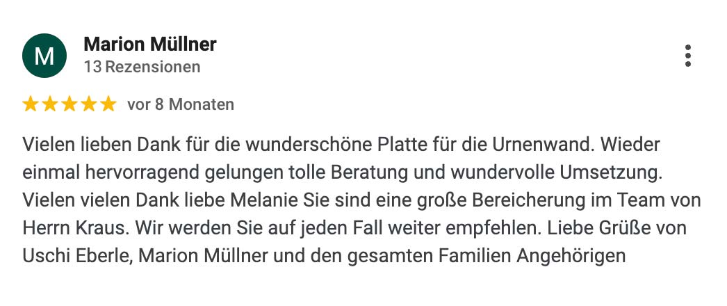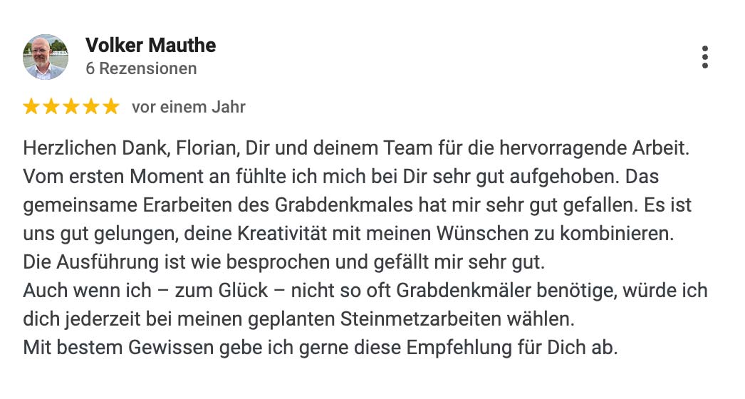 Ob Grabmale, deren Pflege oder hochwertige Natursteine für Haus und Garten. Wir sind Ihr Experte rund um das Thema hochwertige Natursteine. Unser Team steht Ihnen gerne bei der Beratung, Planung und Umsetzung Ihres Vorhabens zur Verfügung. Mit unserem hohen Qualitätsanspruch und jahrelanger Erfahrung möchten wir auch Sie von unserer Arbeit überzeugen. Wir freuen uns auf Sie!